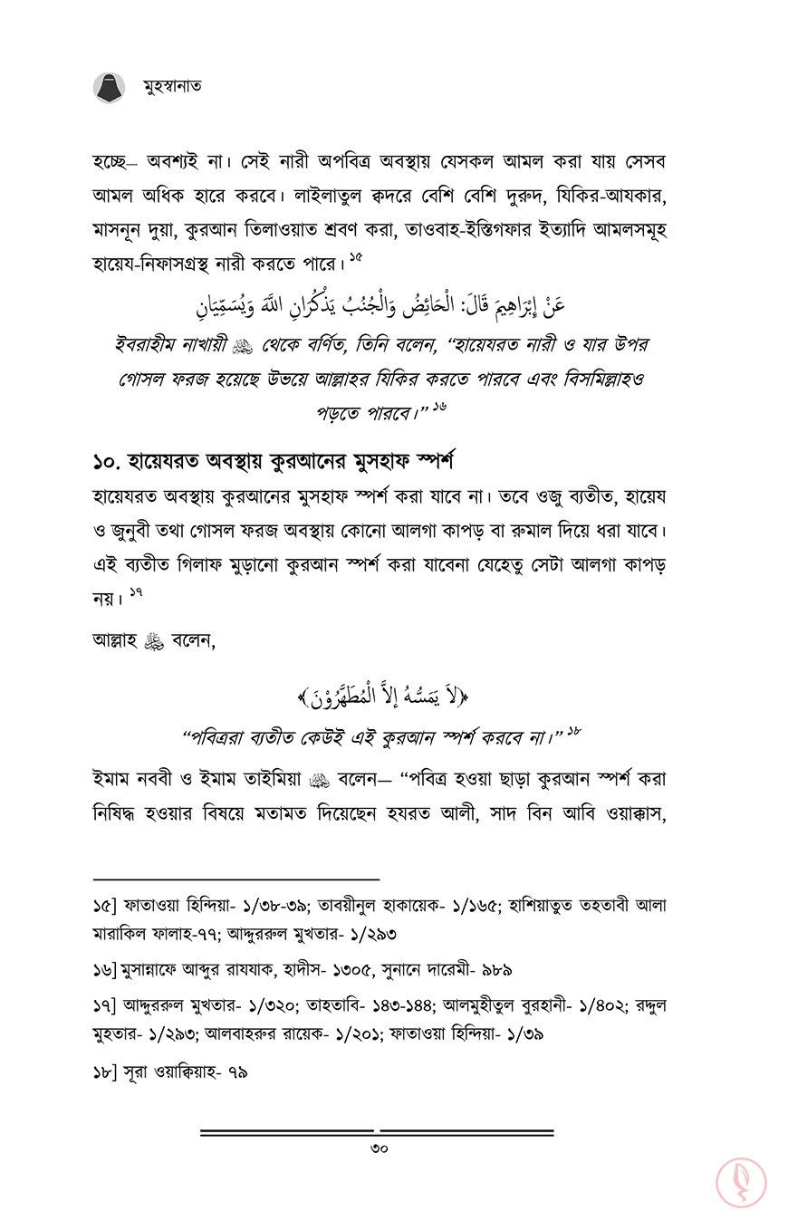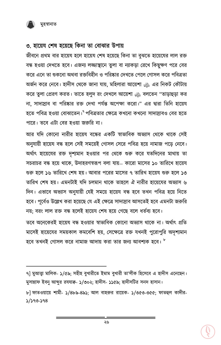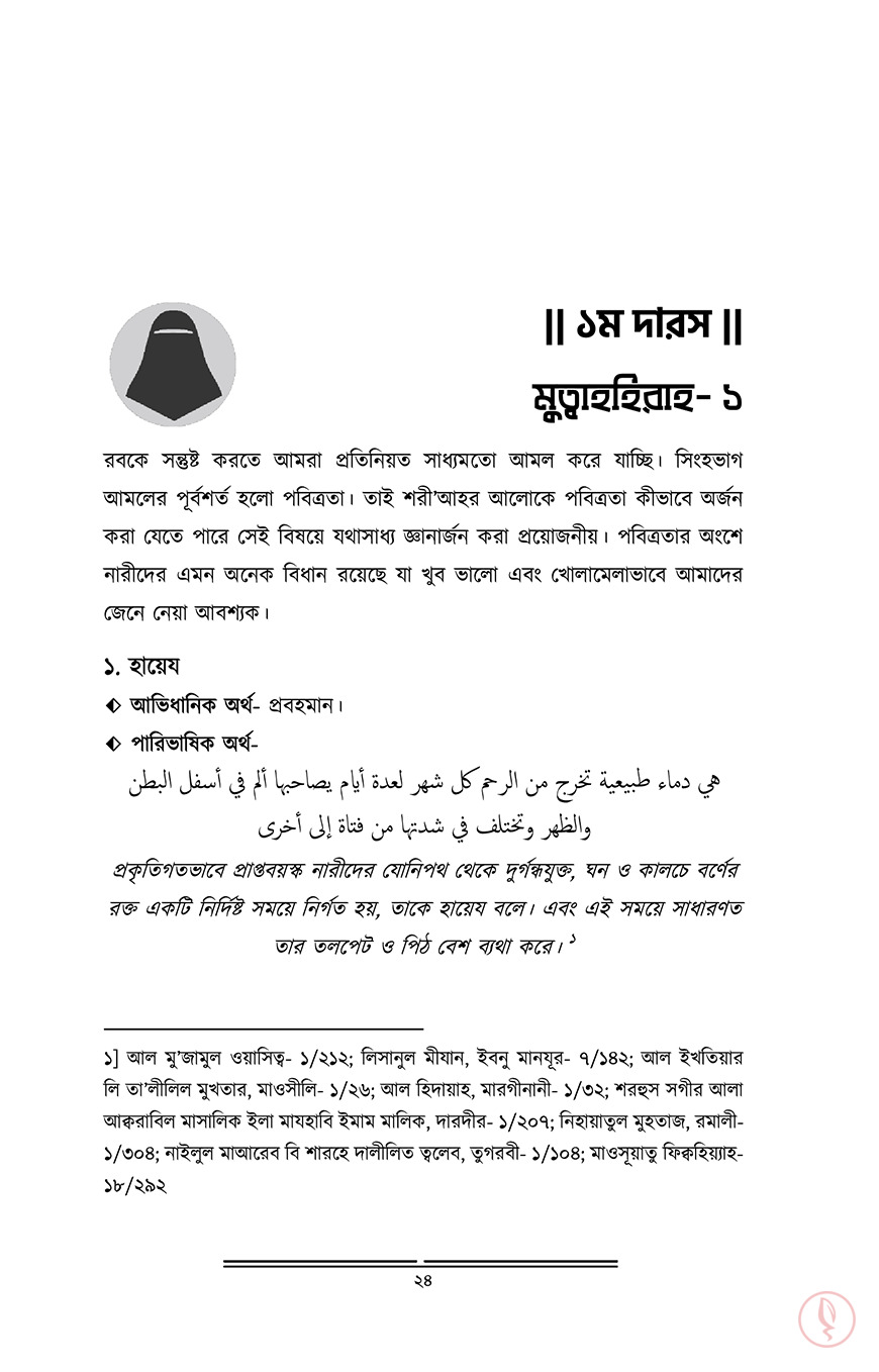 নারী। যাদের জীবনে অনেক দায়িত্ব। শৈশবকাল থেকেই তার সেই দায়িত্ব শুরু হয়ে যায়। কৈশোরের চৌকাঠে পা দিলেই বাবার বাড়ির সংসার গুছানোর দায়িত্ব চেপে বসে কাঁধে। তারপর বয়স হলে বিয়ে, বিয়ের পর শ্বশুর বাড়ি বা নিজের সংসার। স্বামী ও শ্বশুর বাড়ির লোকদের নিয়ে গড়ে ওঠে আরেকটি নতুন জীবন। এরই মাঝে কোল জুড়ে আসে এক চিলতে মায়া। সন্তানকে মানুষ করার ঝোঁক তখন চেপে বসে মাথায়। অনেক দায়িত্ব! আর সেই নারী যদি হয় আল্লাহর মনোনীত দ্বীনের প্রকৃত অনুসারী, তাহলে তো তার দায়িত্ব বেড়ে যায় কয়েকগুণ। সাথে যুক্ত হয় জবাব্দিহিতার ভয়। আল্লাহর সন্তুষ্টি কামনা, স্বামীকে খুশি রাখা, নিজেকে পর পুরুষের দৃষ্টি থেকে হেফাযত করা, সন্তানদের দ্বীনি পরিবেশ দেয়া, চারপাশের মানুষগুলোকে দ্বীনের পথে আহ্বান করা, একবিংশ শতাব্দীর বড় বড় ফিতনাগুলোর বিরুদ্ধে প্রতিনিয়ত যুদ্ধ করে যাওয়া…আরও কত কি!আল্লাহ সুব. তাআলা পবিত্রতা পছন্দ করেন। সেই পবিত্রতা দেহের, সেই পবিত্রতা আত্মার। একজন মুসলিমাহ নিজের দেহ, পোশাক, সৌন্দর্য, চরিত্র, আখলাক সবকিছুই পবিত্র রাখবে, কলুষিত হতে দিবে না। তারাই তো ‘মুহস্বানাত’, তাবৎ দুনিয়ার সবচেয়ে দামী সম্পদ।