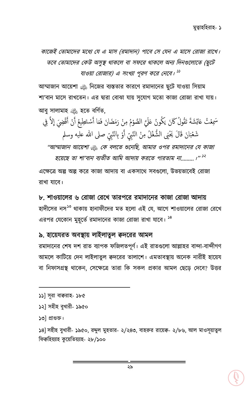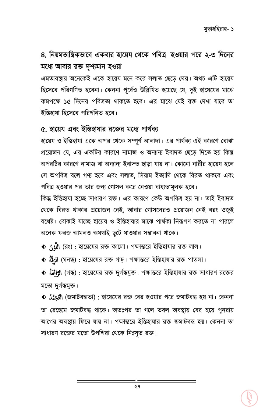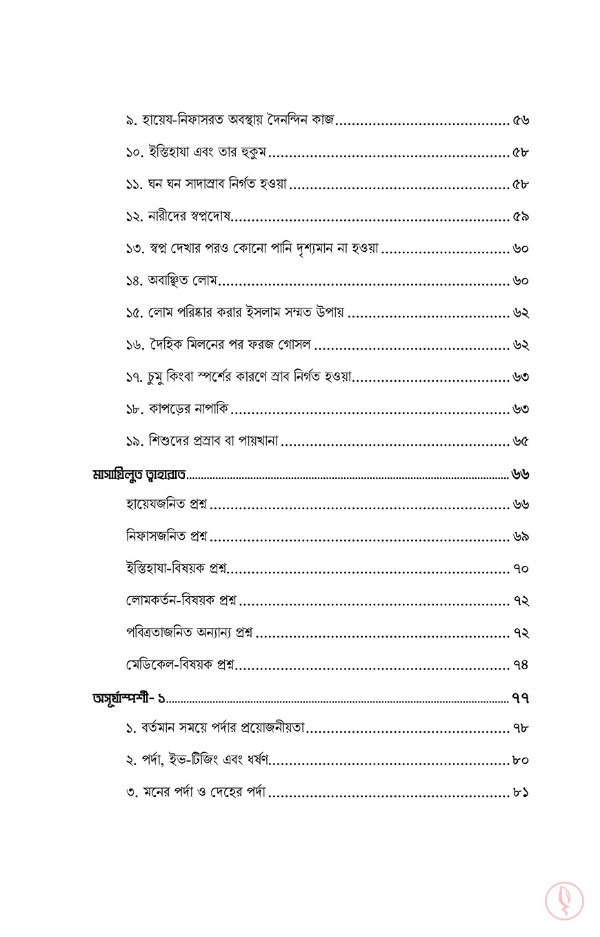 নারী। যাদের জীবনে অনেক দায়িত্ব। শৈশবকাল থেকেই তার সেই দায়িত্ব শুরু হয়ে যায়। কৈশোরের চৌকাঠে পা দিলেই বাবার বাড়ির সংসার গুছানোর দায়িত্ব চেপে বসে কাঁধে। তারপর বয়স হলে বিয়ে, বিয়ের পর শ্বশুর বাড়ি বা নিজের সংসার। স্বামী ও শ্বশুর বাড়ির লোকদের নিয়ে গড়ে ওঠে আরেকটি নতুন জীবন। এরই মাঝে কোল জুড়ে আসে এক চিলতে মায়া। সন্তানকে মানুষ করার ঝোঁক তখন চেপে বসে মাথায়। অনেক দায়িত্ব! আর সেই নারী যদি হয় আল্লাহর মনোনীত দ্বীনের প্রকৃত অনুসারী, তাহলে তো তার দায়িত্ব বেড়ে যায় কয়েকগুণ। সাথে যুক্ত হয় জবাব্দিহিতার ভয়। আল্লাহর সন্তুষ্টি কামনা, স্বামীকে খুশি রাখা, নিজেকে পর পুরুষের দৃষ্টি থেকে হেফাযত করা, সন্তানদের দ্বীনি পরিবেশ দেয়া, চারপাশের মানুষগুলোকে দ্বীনের পথে আহ্বান করা, একবিংশ শতাব্দীর বড় বড় ফিতনাগুলোর বিরুদ্ধে প্রতিনিয়ত যুদ্ধ করে যাওয়া…আরও কত কি!আল্লাহ সুব. তাআলা পবিত্রতা পছন্দ করেন। সেই পবিত্রতা দেহের, সেই পবিত্রতা আত্মার। একজন মুসলিমাহ নিজের দেহ, পোশাক, সৌন্দর্য, চরিত্র, আখলাক সবকিছুই পবিত্র রাখবে, কলুষিত হতে দিবে না। তারাই তো ‘মুহস্বানাত’, তাবৎ দুনিয়ার সবচেয়ে দামী সম্পদ।