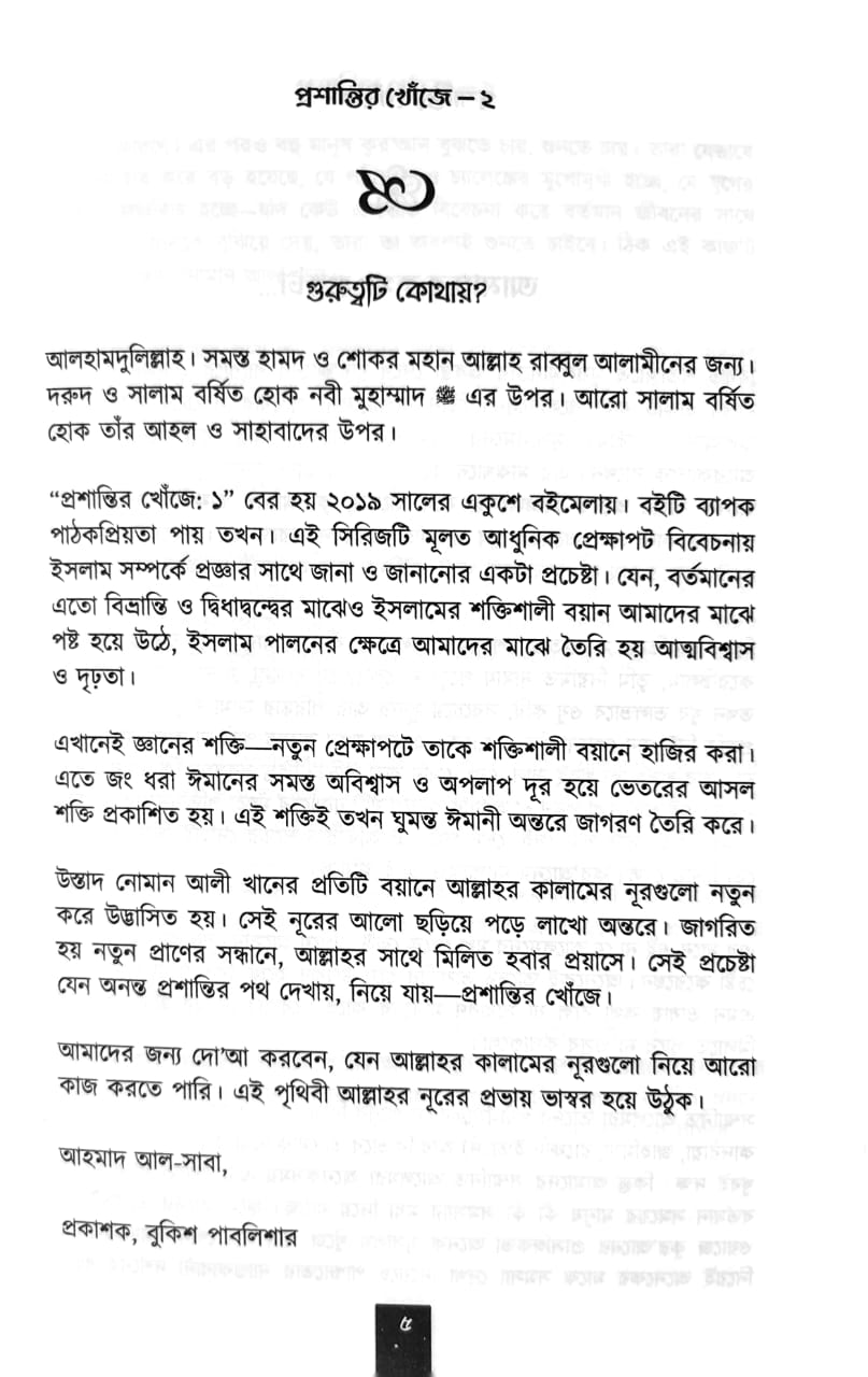উস্তাদ নোমান আলী খান, যিনি স্বপ্ন দেখেন আল-কুরআন দিয়ে বিশ্বকে পরিবর্তনের, মুসলিম বিশ্বের উন্নয়নের, মুসলিম মানসের কুসংস্কারাচ্ছন্ন জীবনকে দ্বীনের আলোয় গড়ার। তার আল-কুরআনের গভীর অথচ সহজে বিশ্লেষিত বিষয়গুলো নিয়েই জীবনঘনিষ্ঠ ও বর্তমান বিশ্বের আলোকে সাজানো বই “প্রশান্তির খোঁজে”।