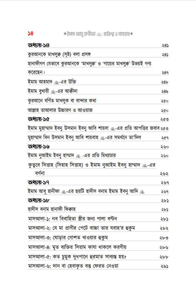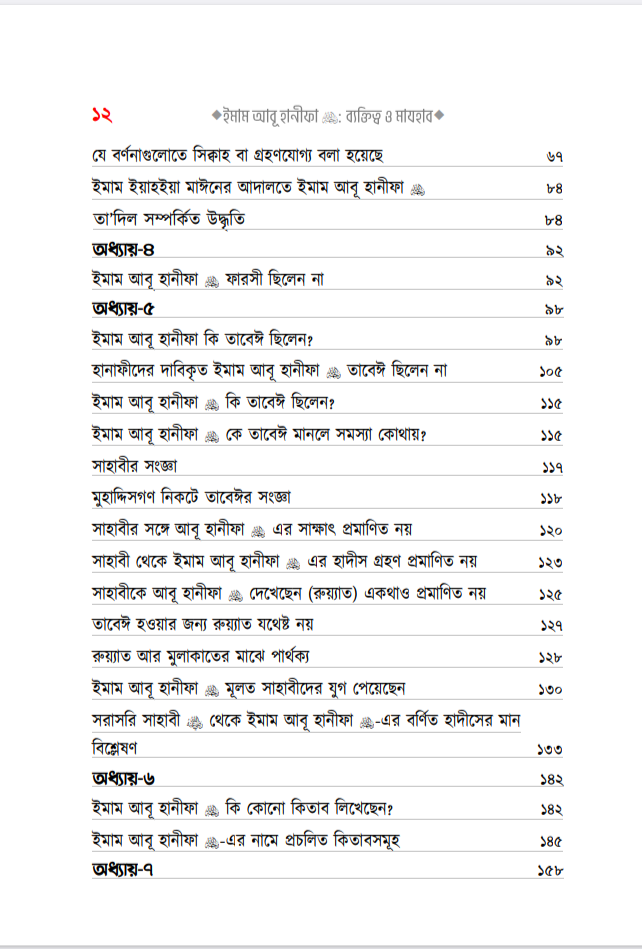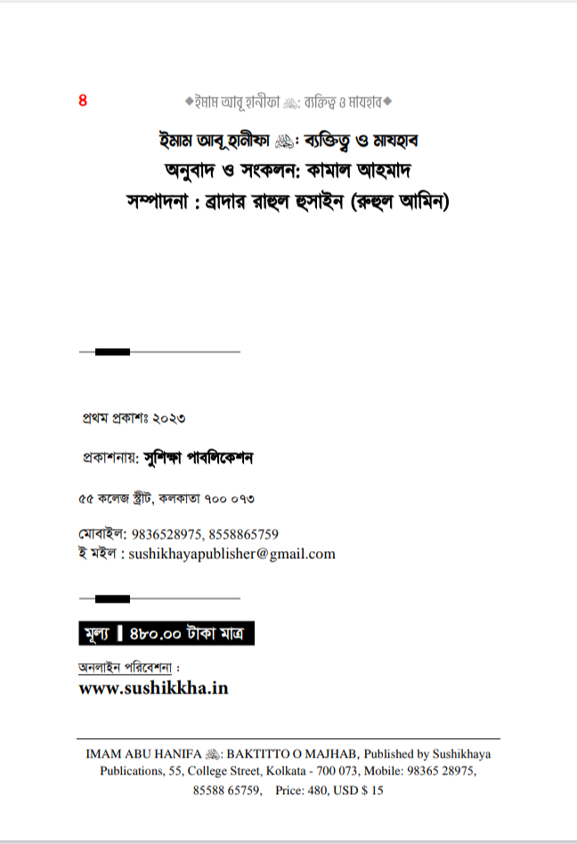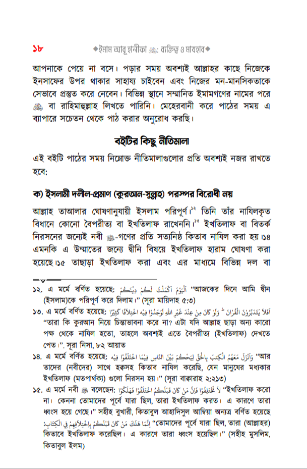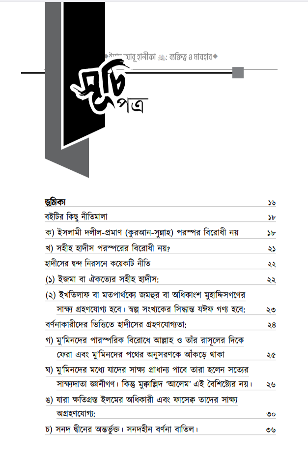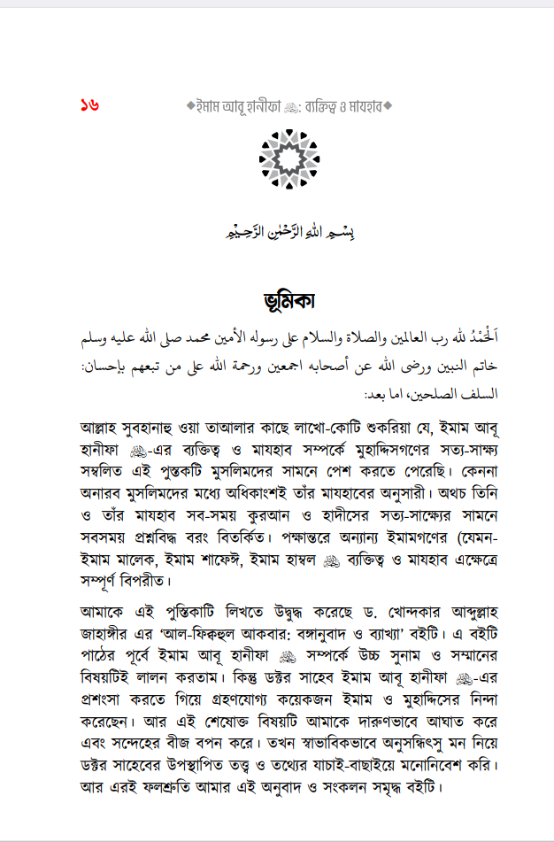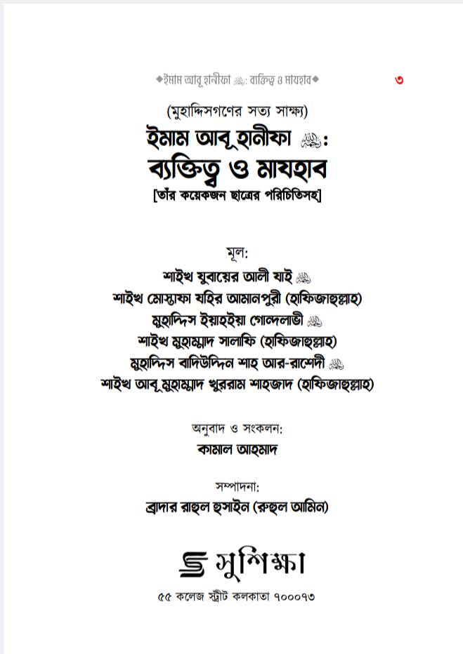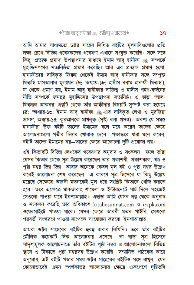 সম্পাদকের কথাঃ بسْمِ اللهِ الرَّحْمٰنِ الرَّحِيمِ إن الحمد لله والصلاة والسلام على رسول الله وعلى آله وصحبه أجمعين، أما بعد: সকল প্রশংসা আল্লাহর জন্য, যিনি আমাদেরকে মানুষ হিসেবে সৃষ্টি করেছেন। তিনি জ্ঞানের মণিমুক্তা আহরণের সুযোগ করে দিয়ে মানবজাতীকে ধন্য করেছেন, যার দয়ায় সমস্ত সৃষ্টিকুল বেঁচে আছে। অতঃপর লাখো-কোটি দরূদ ও সালাম বর্ষিত হোক মুহাম্মাদ -এর উপর, যিনি আগমণ করেছিলেন মানব ও জিন জাতিকে হেদায়াত প্রদর্শনের জন্য, যাকে না পেলে আমরা অন্ধকারের অতল তলে নিমজ্জিত থাকতাম, যার পরশ পেয়ে জাহেলী যুগের মানুষগুলো সোনার মানুষে পরিণত হয়েছিল, যাকে আল্লাহ রাব্বুল আলামীন রহমাতুল্লিল আলামীন বানিয়ে এই দুনিয়াতে পাঠিয়েছেন। নিকট অতীতে যেসকল সৌভাগ্যবান ব্যক্তিদেরকে আল্লাহ তা’আলা স্থায়ী প্রসিদ্ধি দান করেছেন এবং স্বীয় বান্দাদের অন্তরে তাঁদের প্রতি ভালবাসা সৃষ্টি করে দিয়েছেন, তাঁদের মধ্যে একজন সৌভাগ্যবান হলেন ইমাম, ফক্কিহ ইমাম আৰু হানিফা এ (মৃ. ১৫০)। আল্লাহ তাঁর অসীম দয়ায় তাঁকে আবৃত্ত করুন, যার দ্বারা অসংখ্য মানুষ উপকৃত হয়েছেন, যাদের সংখ্যা স্রেফ আল্লাহ-ই জানেন। কোনো বড় মানুষ সম্পর্কে তিন শ্রেণীর লোক থাক (১) তার প্রতিটি কথাকে গ্রহণকারী মুকাল্লিদ এবং তার স্তুতি ও প্রশংসাকারী। (২) তার প্রতিহিংসা পোষণকারী ও মানুষদেরকে তার প্রতি বিদ্বেষ সৃষ্টিকারী। (৩) মধ্যমপন্থী, যারা তার ভাল দিকগুলোর স্বীকৃতি প্রদান করেন এবং এটাও মনে করেন যে, মানুষ হওয়ার দরুন তার ভুলও হতে পারে। সুতরাং তার ভাল কর্ম ও অপরিসীম খেদমতের দৃষ্টিকোণ থেকে তারা একে স্রেফ সমালোচনা ও পর্যালোচনার লক্ষ্যবস্তু বানান না। অবশ্য তার ভুলগুলো সম্পর্কে সতর্ক করার ব্যাপারে তারা কোনো দ্বিধা-সংকোচ করেন না। বরং জ্ঞানী-গুণীদের দায়িত্ব হলো, সাধারণ জনগণকে এরূপ ভুলসমূহ সম্পর্কে সাবধান করে দেওয়া এবং হক ও ইনসাফের সাথে সিরাতে মুস্তাক্বীম-এর পথে দিকনির্দেশনা দান করা। আমাদের পূর্বসূরীদের পথ ও পন্থা এটিই ছিল। আর এটিই সালাফীদের পথ। ইমাম আবূ হানিফা সম্পর্কেও অনেকটাই এরকম ঘটেছে বলে মনে হয়। উল্লেখ্য যে, তাঁর প্রশংসাকারীরা প্রসংশা করতে গিয়ে বাড়াবাড়ি করেছে। যেমন, يَكُونُ في أُمَّتِي رَجُلٌ يُقَالُ لَهُ أَبُو حَنِيفَةَ وَهُوَ سِرَاجُ أُمَّتِي অর্থাৎ ‘আমার উম্মতের মাঝে এমন একজন ব্যক্তি আসবে যার নাম আবূ হানীফা। সে আমার উম্মতের প্রদীপতুল্য’। ‘ سَيَأْتِي بَعْدَ رَجُلٌ يُقَالُ لَهُ نُعْمَانُ بن ثابت الكوي وَيُكْنى بأبي حَنِيفَةَ لَيُحْسِنُ دِينَ اللَّهِ وَسُنَّتِي عَلَى يَدِهِ অর্থাৎ ‘অচিরেই আমার পরে একজন ব্যক্তির আবির্ভাব হবে, যার নাম হবে নু’মান ইবনু সাবেত আল-কুফী, যার উপনাম হবে আবূ হানীফা। সে আল্লাহর দ্বীন ও আমার সুন্নাহকে নিজ হাতে সাজাবেন’। ‘ يَخْرُجُ فِي أُمَّتِي رَجُلٌ يُقَالُ لَهُ أَبُو حَنِيْنَهُ وَبَيْنَ كَتِفِهِ خَ