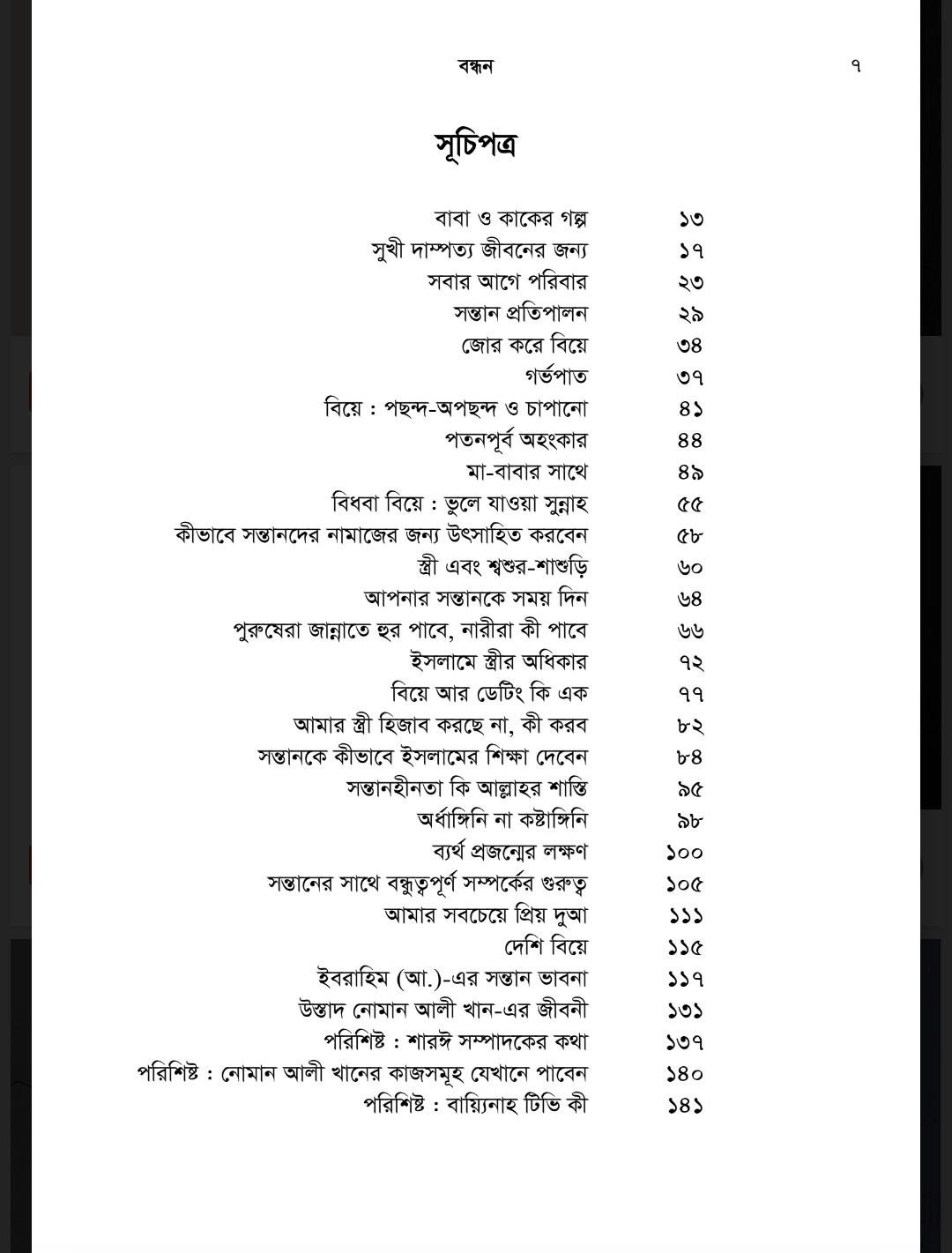 ইসলামের আত্মিক শান্তি ও সামাজিক শীতলতা যদি এই পৃথিবীতে প্রতিষ্ঠিত করতে চাই, তবে শুরুতেই ইসলামকে আমাদের পরিবারে প্রতিষ্ঠা করতে হবে। ইসলামের বাণী পৃথিবীর সর্বত্র ছড়িয়ে পড়বে তখনি যখন প্রত্যেক মুসলিম সন্তান বড় হবে ইসলামকে তার হৃদয়ে ধারণ করে। পৃথিবীতে ন্যায় প্রতিষ্ঠা হবে তখনই যখন পরিবারের সদস্যরা অন্যায় থেকে বিরত থাকবে। বাবা-মা সন্তানের হক নষ্ট করবে না, আবার সন্তান বাবা-মা এর প্রতি নীতিপরায়ণ হবে। স্বামী-স্ত্রী একে অপরের দুর্বলতার সুযােগ নিবে না বরং একজন আরেকজনের ঢাল স্বরুপ হবে। কিন্তু বর্তমানে মুসলিম সমাজে ইসলামের দেখিয়ে দেওয়া পথ অনুসরণ তাে হচ্ছেই না বরং কুরআনের আয়াত অপব্যবহার করে স্বামী স্ত্রীর অধিকার ছিনিয়ে নিচ্ছেন, নিজ কর্তব্য পালন না করে অধিকারের কথা বলছেন, অভিভাবক সন্তানের উপর তাদের অন্যায্য সিদ্ধান্ত চাপিয়ে দিচ্ছেন। মুসলিম পরিবারকে এসব অনাচার থেকে রক্ষা করার তাগিদ থেকেই উস্তাদ নুমান আলী খান পরিবারে আমাদের দায়িত্ব ও কর্তব্য নিয়ে কুরআনের ভিন্ন ভিন্ন আয়াতের আলােকে বিভিন্ন সময়ে কিছু বক্তব্য দিয়েছেন; যার সংকলিত সূতিকাগার হচ্ছে এই ‘বন্ধন’ বইটি। ‘বন্ধন’ বইয়ের সূচিপত্রঃ